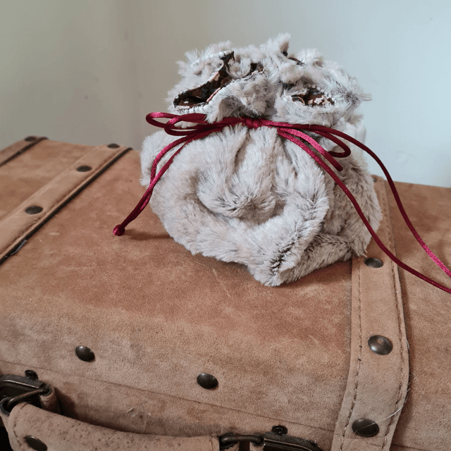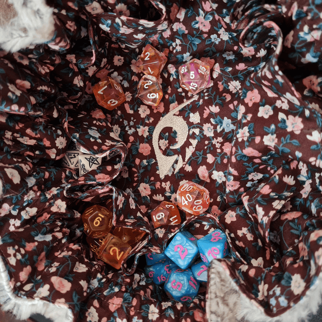 With a diameter of 40 cm, it can easily store at least 20 sets of dice or 140 small items. The drawstring closure keeps everything secure, with sturdy satin polyester cords sliding smoothly through the fabric, embellished with matching charms.